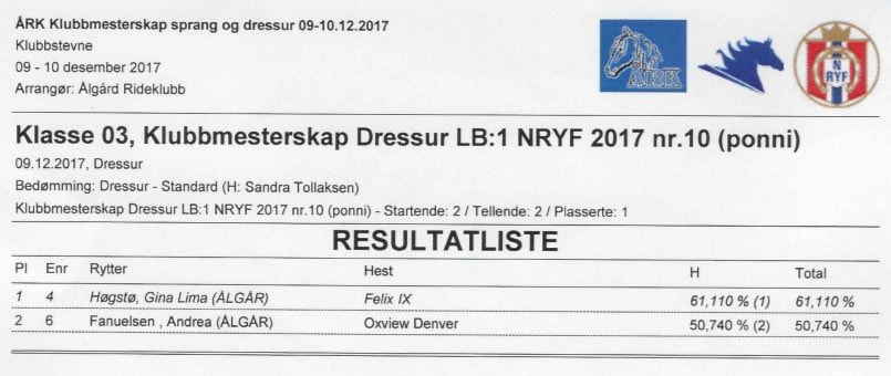 Lørdagen var det dressurkonkurransene som stod for tur. Her var der mange flotte prestasjoner og det viste seg at alle hadde øvd godt på øvelsene sine. Det kan ses på deltakerlistene at på ÅRK er det sprang som er den største grenen og at dressur kommer i andre rekke.